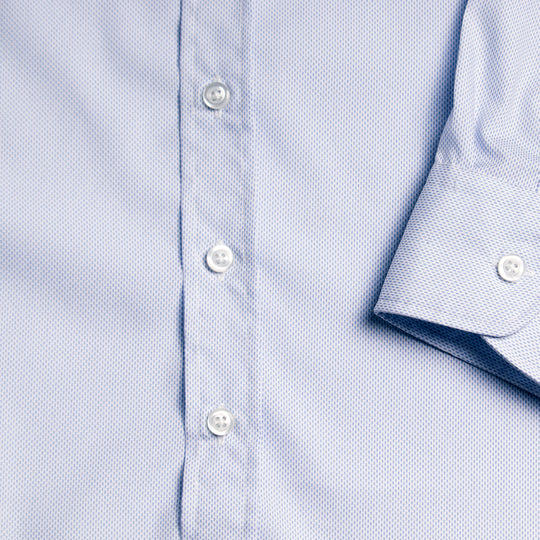Close up view of the blue swiss dot pattern on the dress shirt by Kirrin Finch