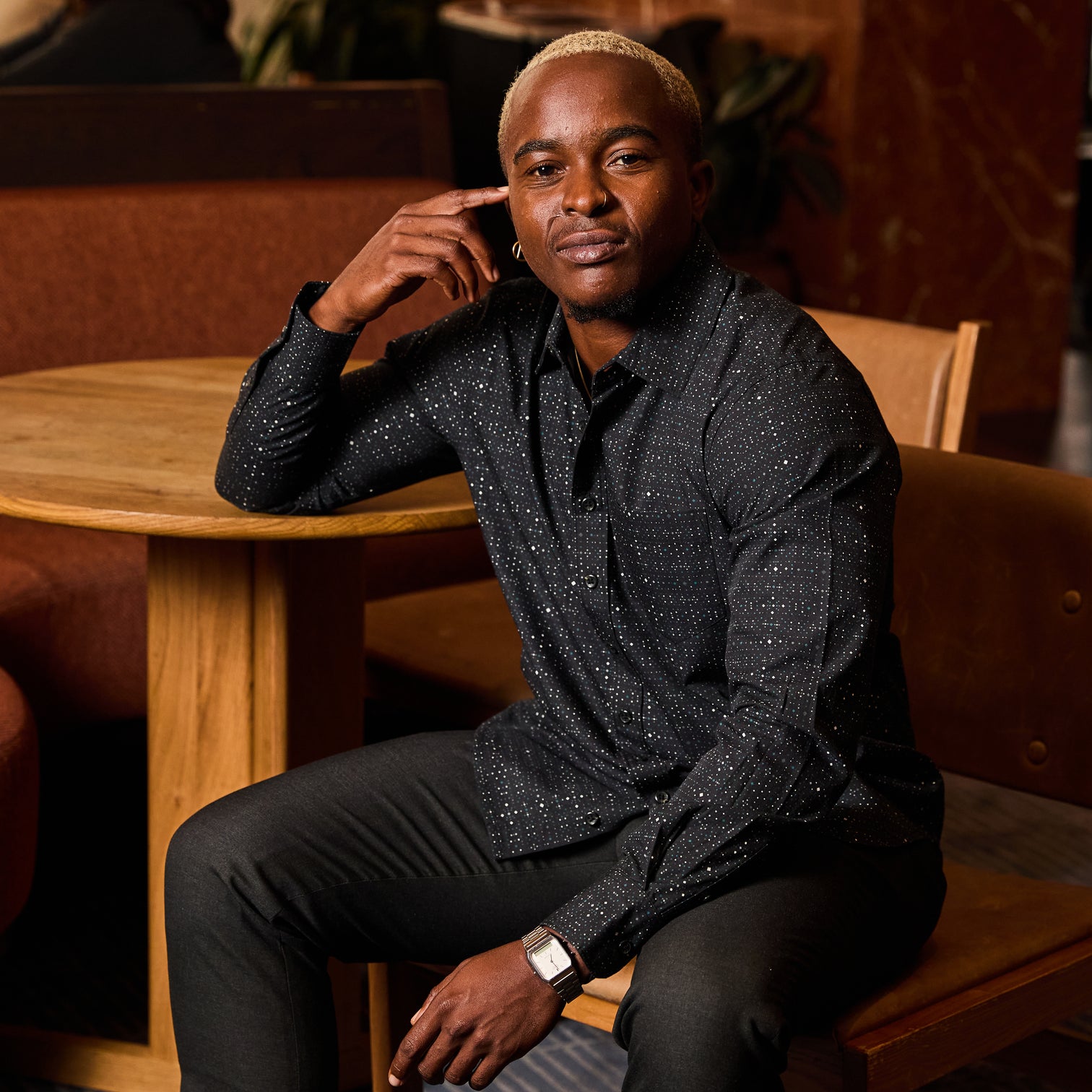 Out-of-this-world look, down-to-earth comfort! The stylized galaxy print evokes the night sky, with a point collar that keeps things sharp.