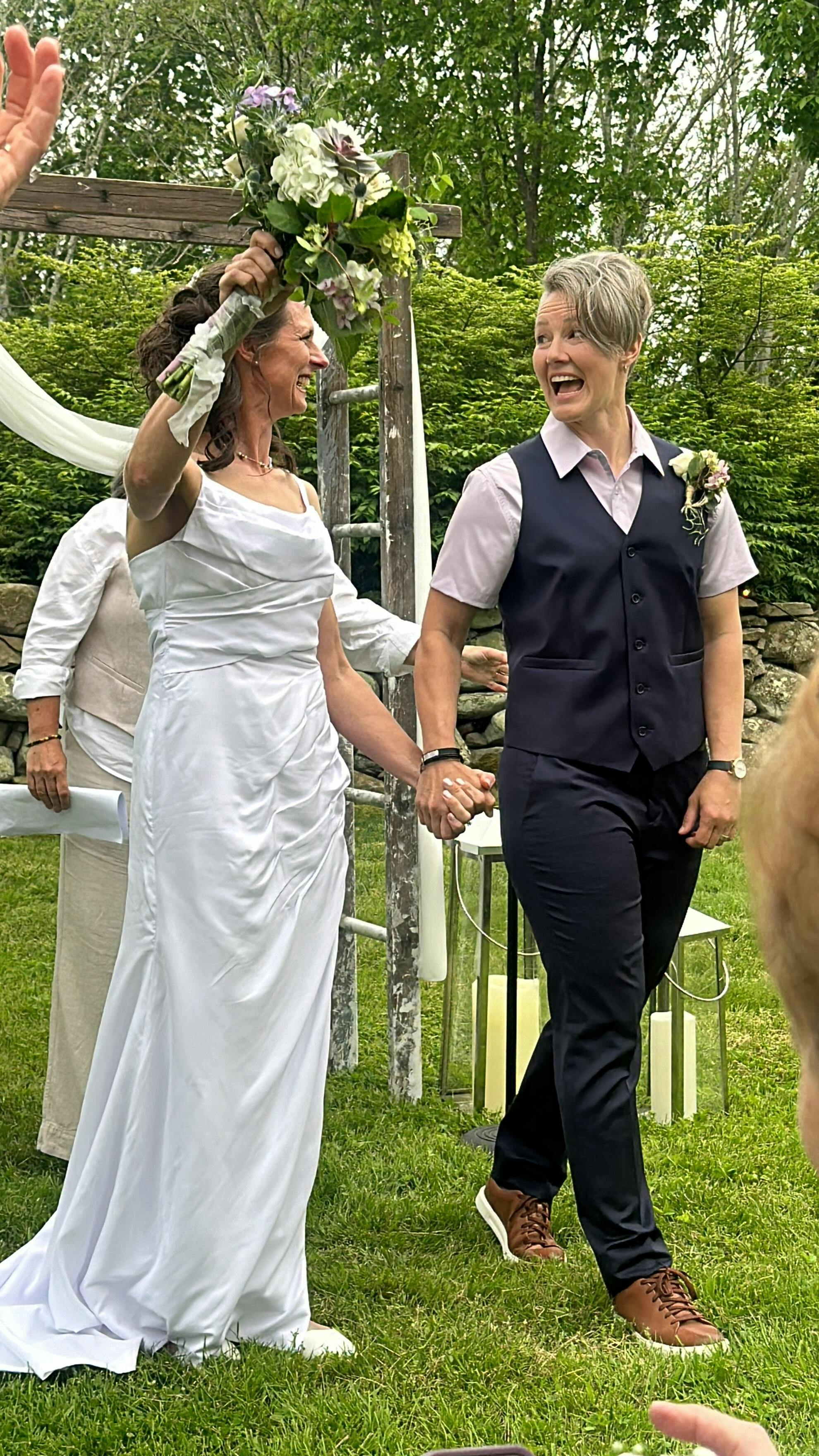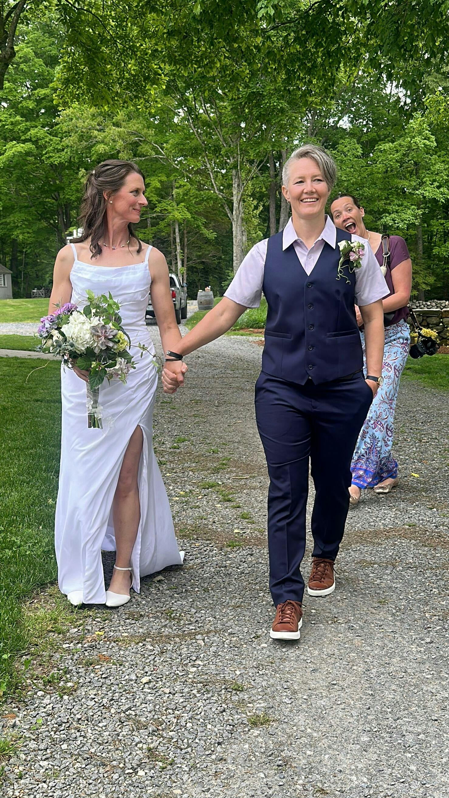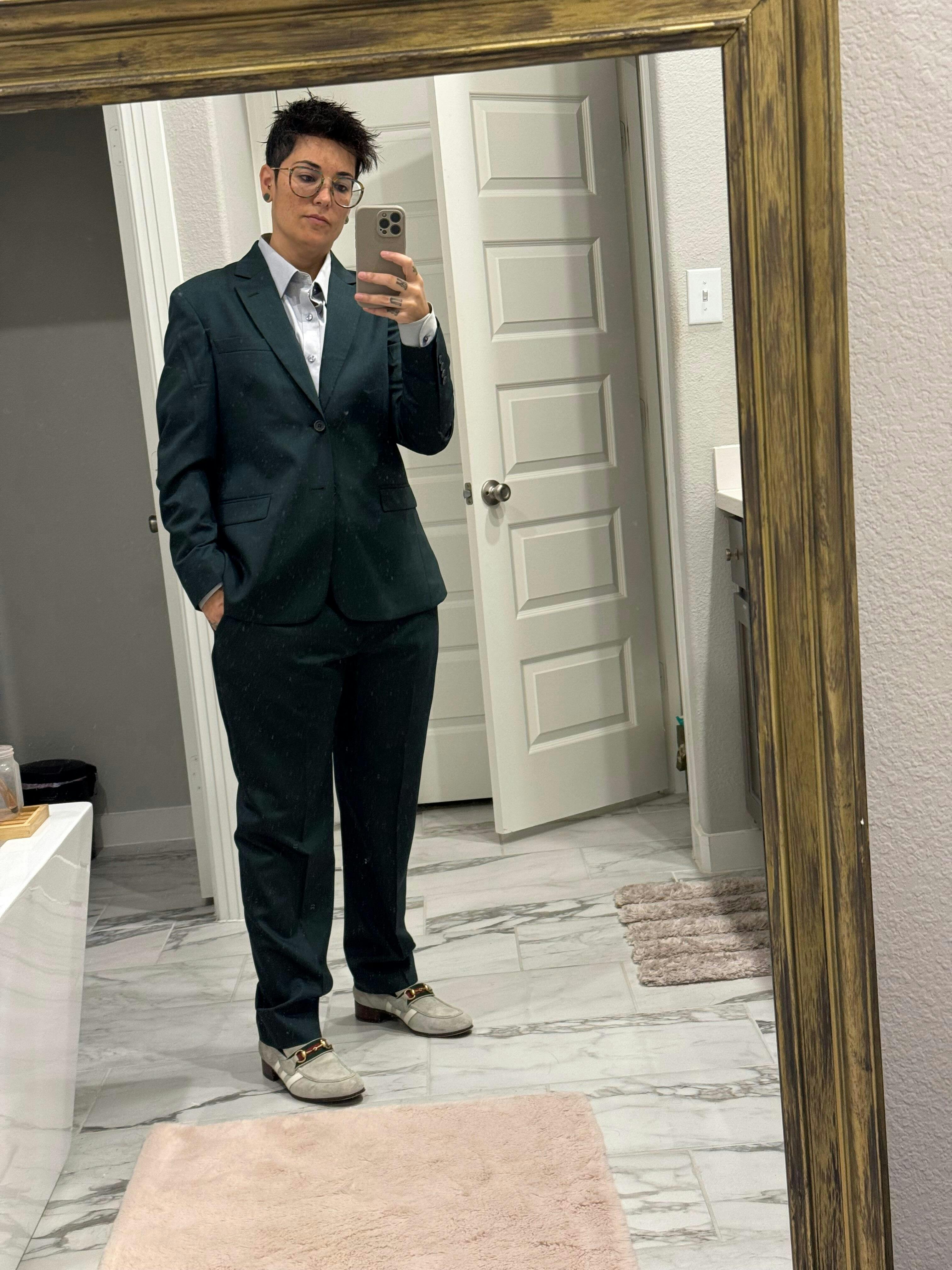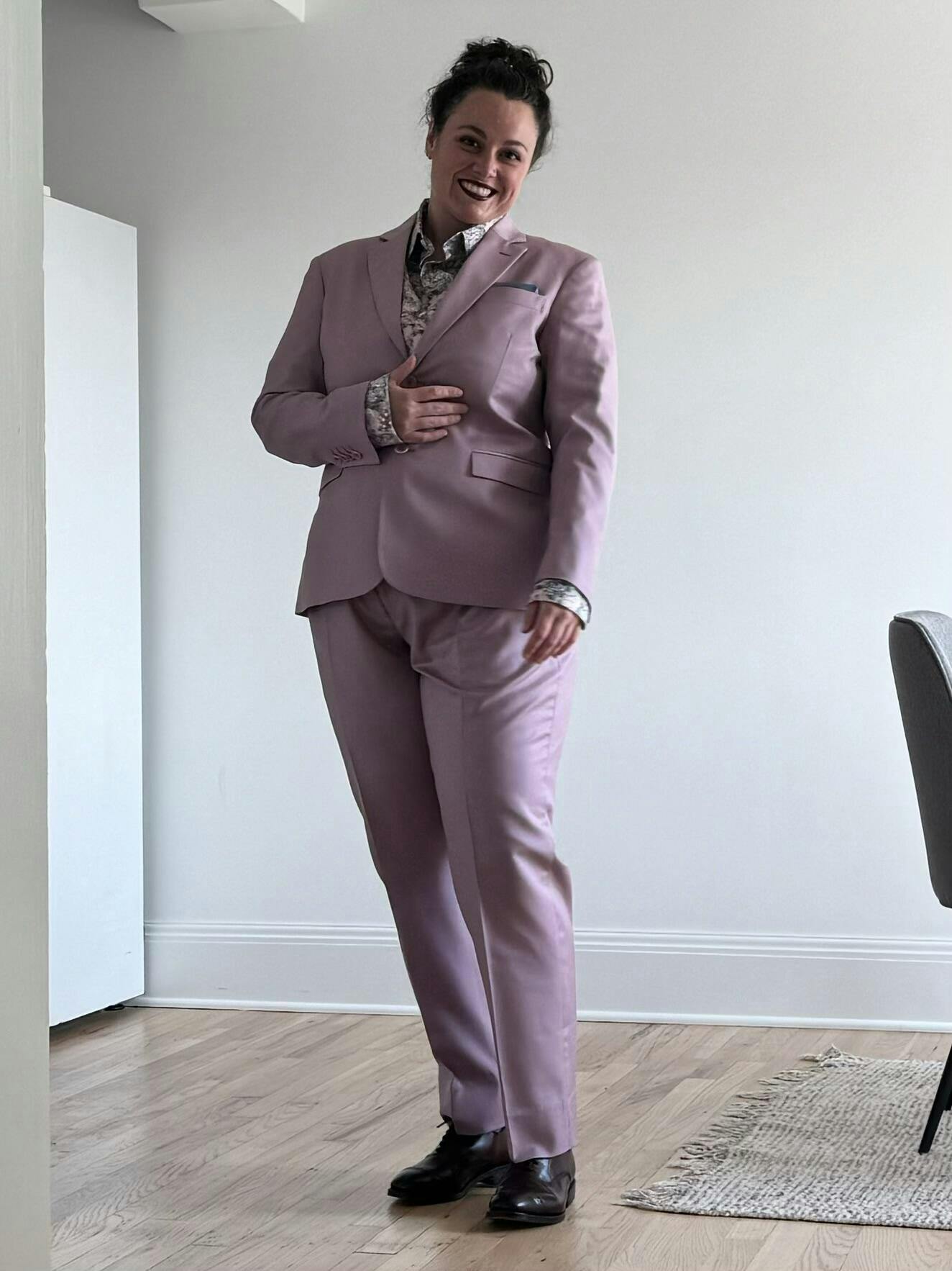 This suit is incredible. These photos are of someone who was made to wear dresses her whole life, as recently as this year being a bridesmaid at a family wedding. In these photos you see a woman who will never wear a dress again. I have never worn something so comfortable, so stylish, and so affirming of who I am. Kirrin Finch can have all my money, I will be buying more for sure. The jacket fits true to size, be sure to use the size guide measurements for the pants because the numbered sizes didn’t quite line up with my usual numbered size. Kirrin Finch’s customer service was excellent in helping me exchange my pants when I ordered an incorrect size that was too tight. Here I’m wearing a size XL jacket and size 20 pants. I usually wear a size 16 pants.